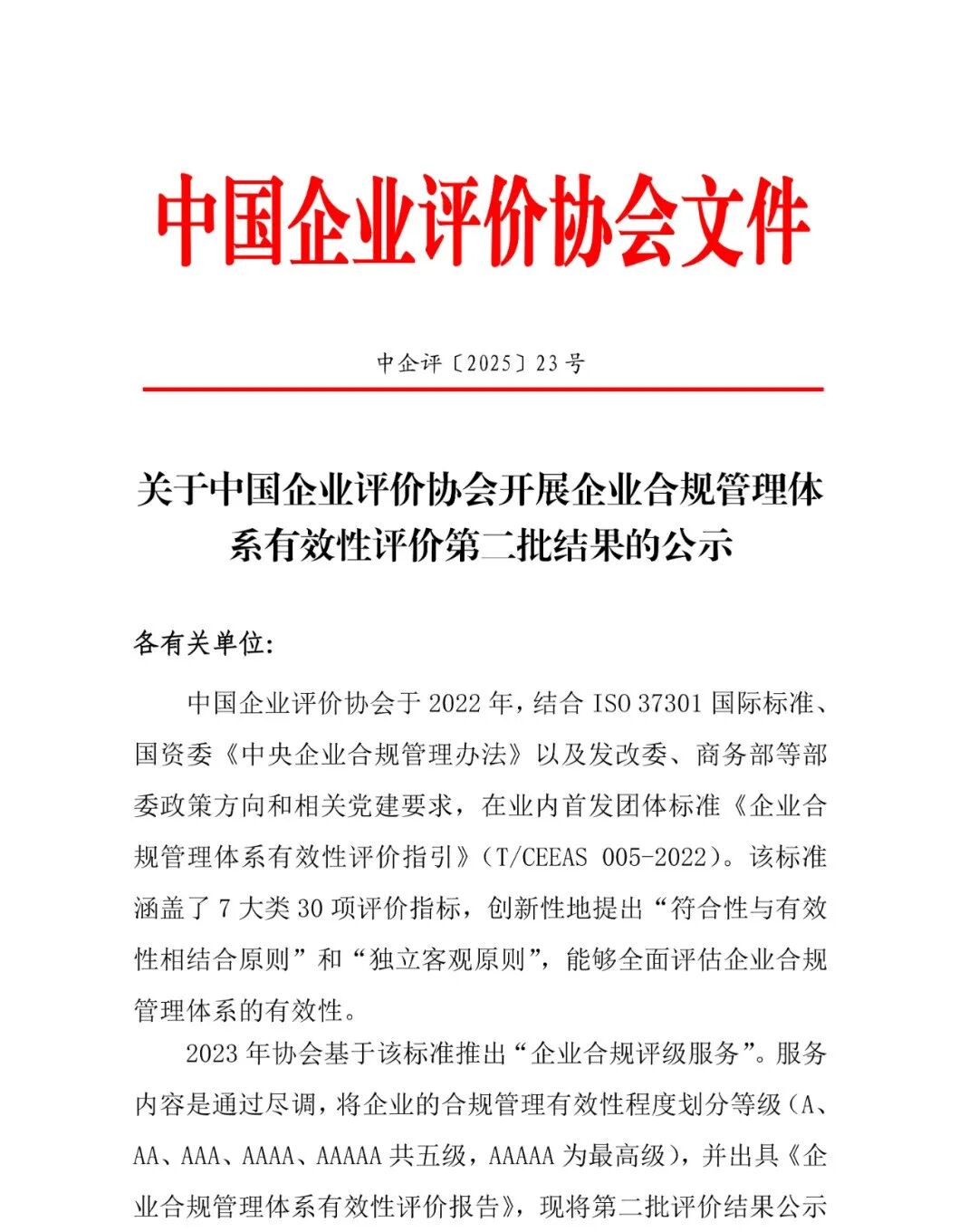 经过严格的审核评估流程和专家组的权威评定,中国企业评价协会第二批企业合规管理体系有效性评价工作圆满完成!最终共有15家企业荣获最高等级——5A级评价。