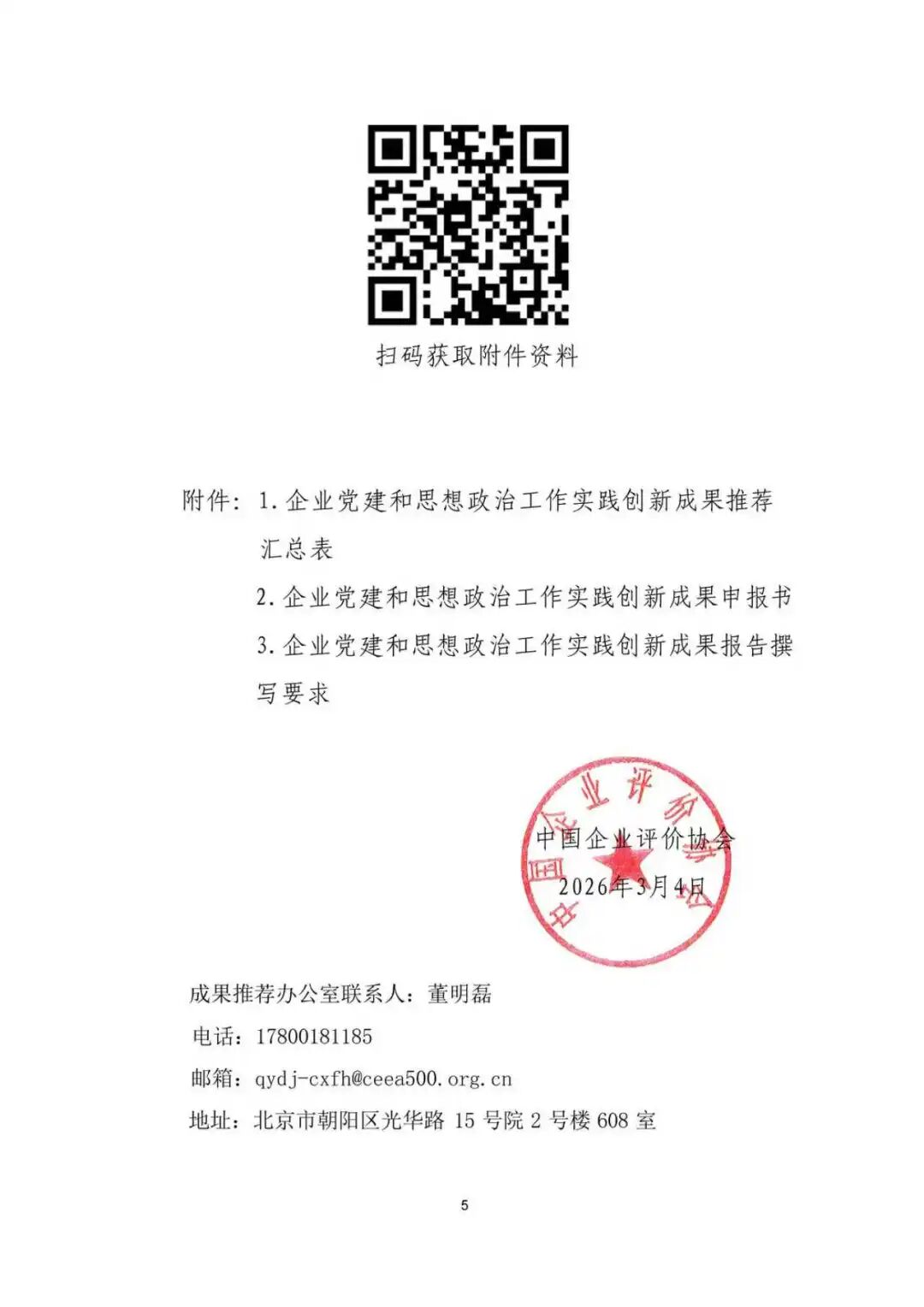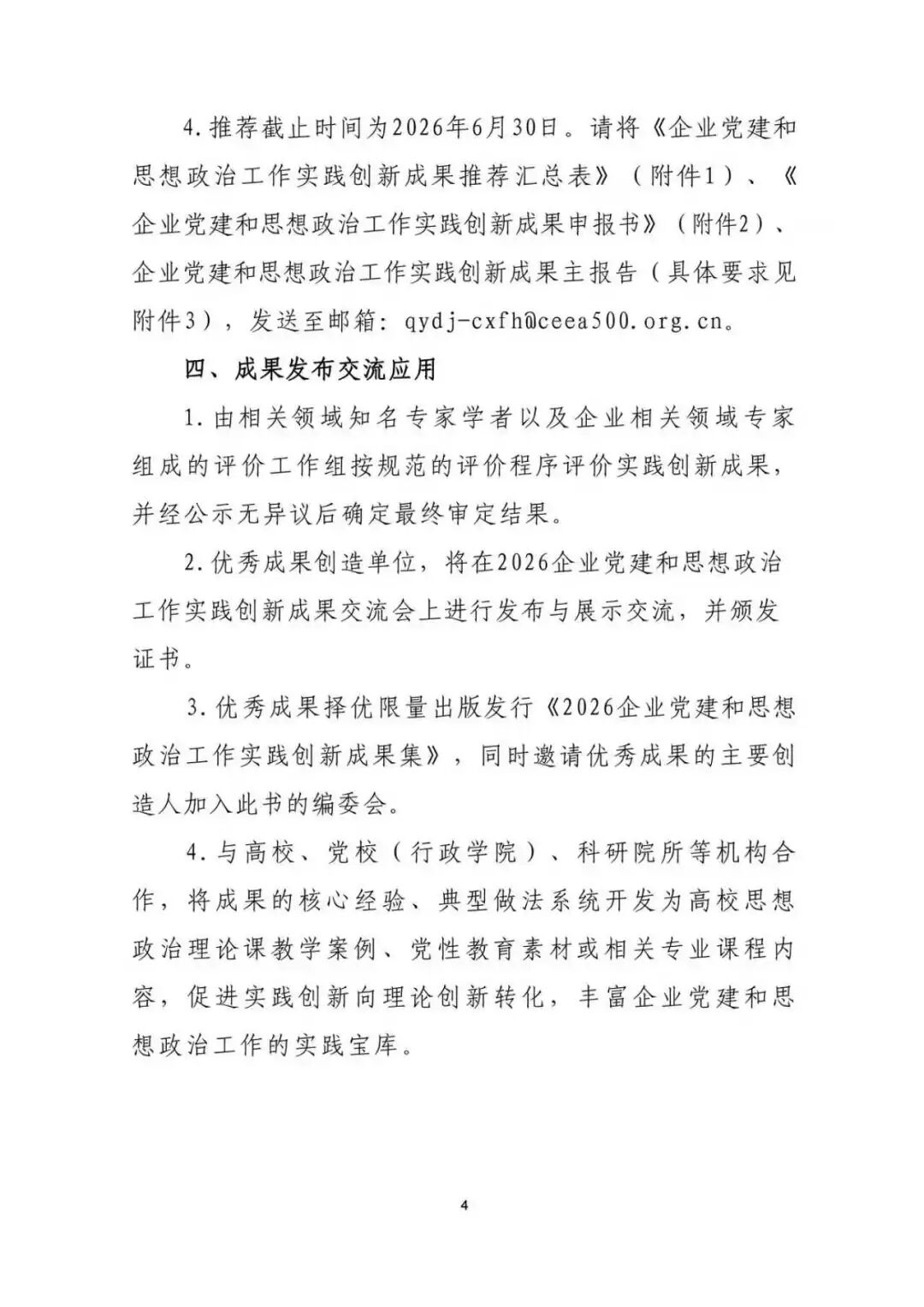 4.推荐截止时间为2026年6月30日。请将《企业党建和思想政治工作实践创新成果推荐汇总表》(附件1)、《企业党建和思想政治工作实践创新成果申报书》(附件2)、企业党建和思想政治工作实践创新成果主报告(具体要求见附件3),发送至邮箱:qydj-cxfh@ceea500.org.cn。